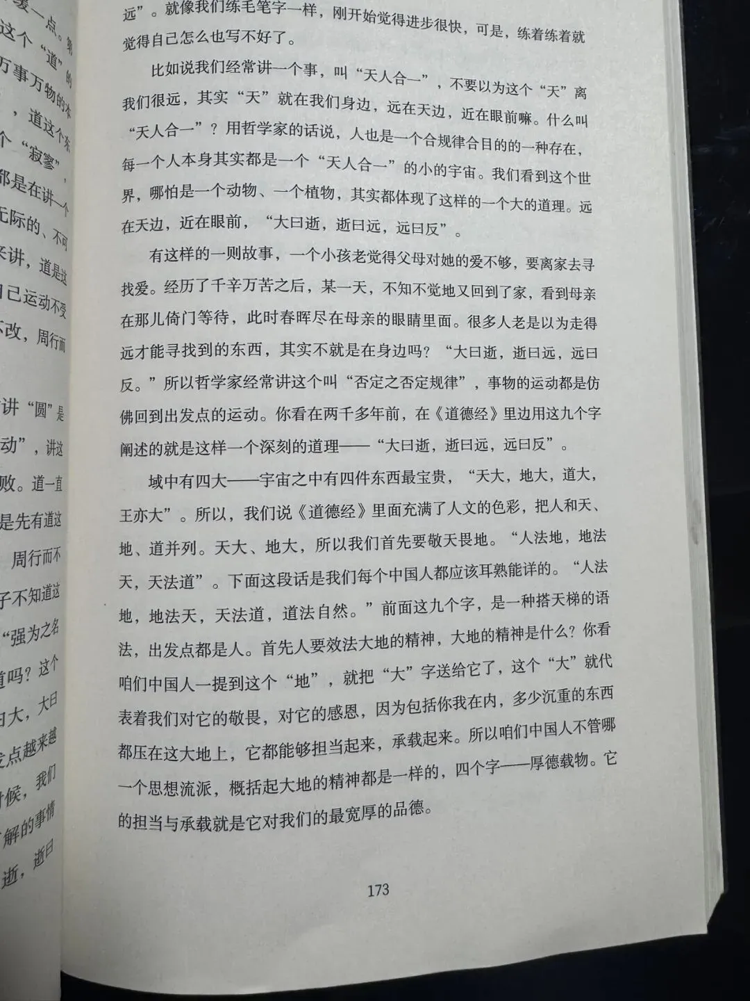 道离开出发点开始运动起来,离出发点开始运动起来,越来越远.最后又回到原点。事物的运动都是仿佛回到出发点的运动。如:天人合一,不要以为天离得很远,天就在我们身边。,人也是一个合规律的存在,每一个人本身其实都是“天人合一”的小的宇宙。