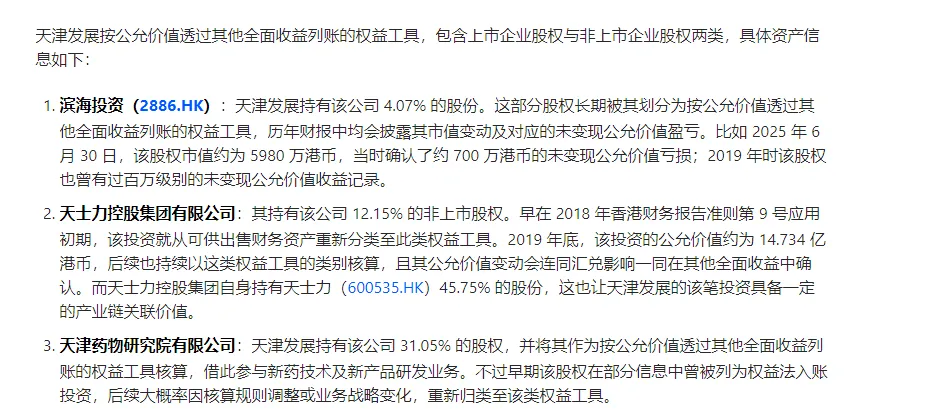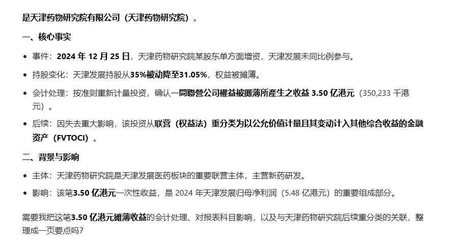 天津药物研究院在 2024 年 12 月增资后,天津发展失去重大影响,从权益法联营重分类为按公允价值透过其他综合收益列账之权益工具(FVOCI),并非 FVTPL。