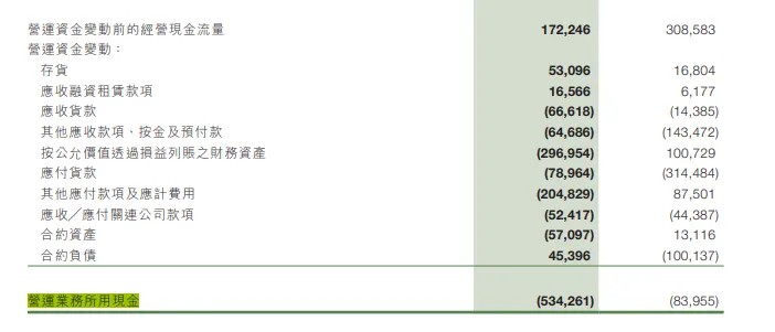 再加上公允价值变化和应付费用减少,最终经营现金流出现负数。