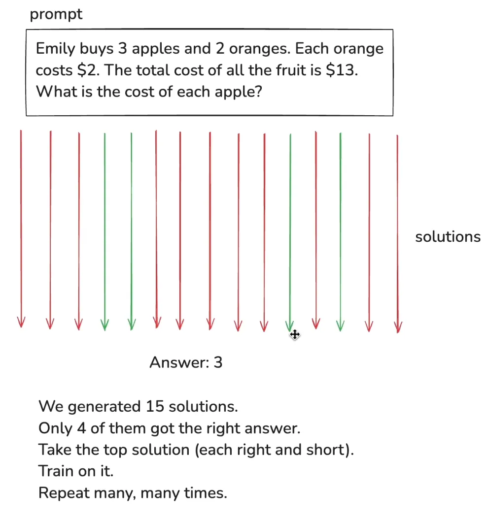 具体做法很直观:给模型一个问题 → 采样成百上千个不同解法 → 检查哪些得到了正确答案(通常是有正确答案的客观题,例如数学) → 强化正确的解法路径 → 重复迭代。