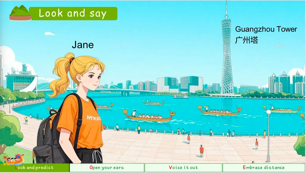 And where is she?In Guangzhou. What are people doing in Guangzhou?Let’s have a look. Listen. Where is she going?
