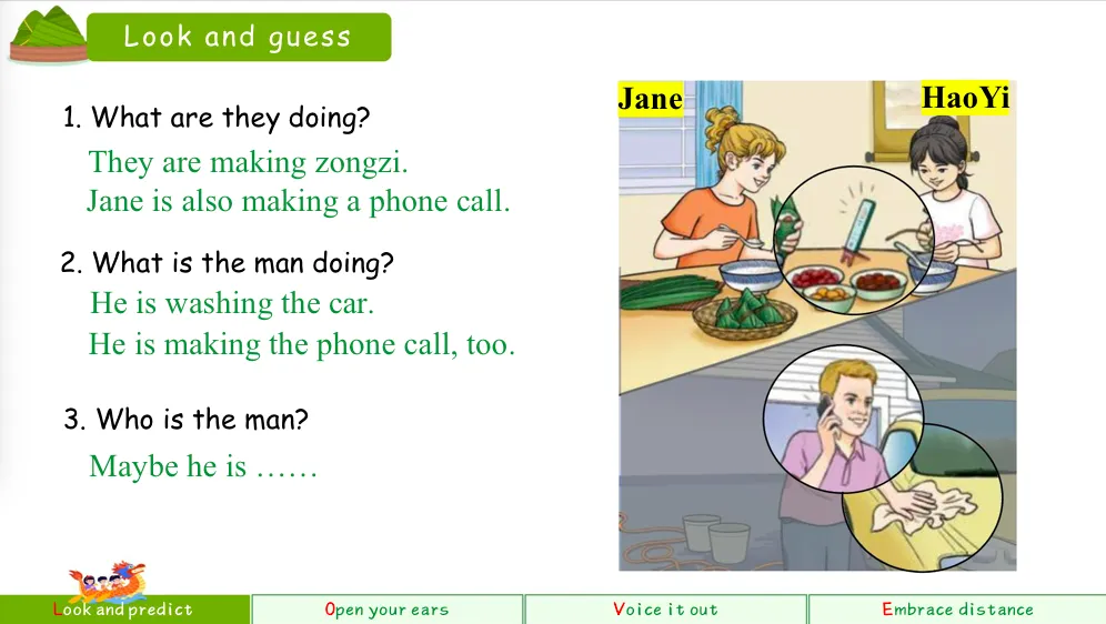 Look!Who are they?They are Jane and Hao Yi. And what are they doing?What are they doing? Yeah, you, microphone please. They are making zongzi and Jane is also making a phone call. Wow, sharp eyes for the details. Sit down, please.