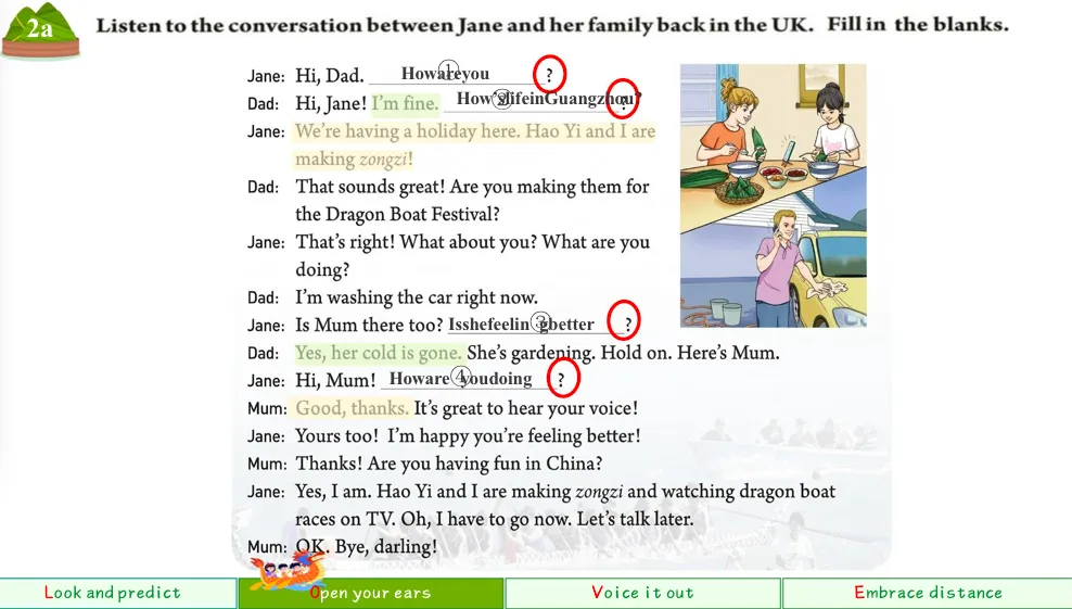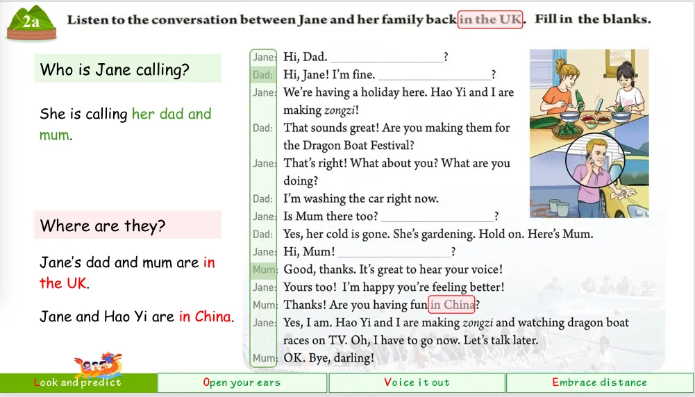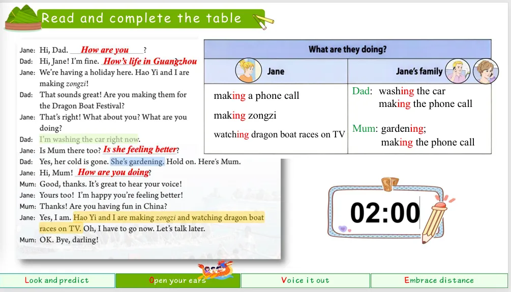 OK, time is up.Who wants to share your answers? What is Jane doing?Yes, you, please. Microphone. What is Jane doing? Jane is making zongzi. Making zongzi, OK. And she is watching dragon boat races. And how about her dad?Her dad is washing the car. And her mom? Her mom is gardening. Excellent! Thank you. Sit down, please.