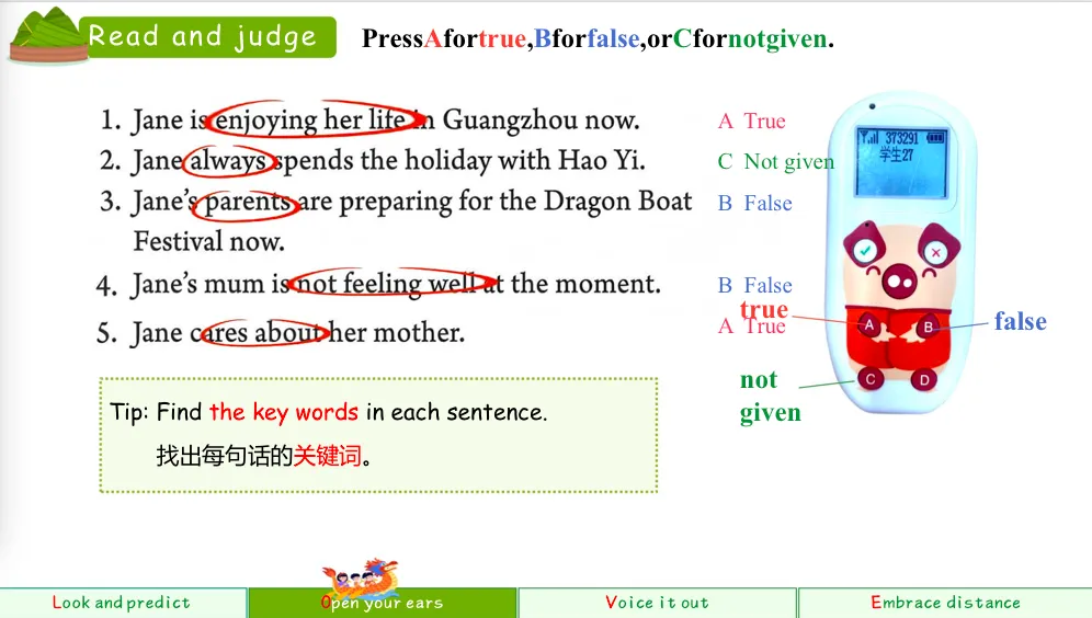 Now let's read for more details. Please read and decide if the statements are true, false or not mentioned. Press A for true, B for false, and C for not given. Clear? OK, here we go.
