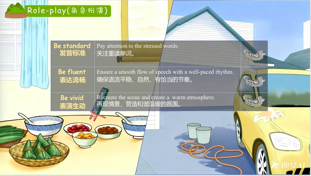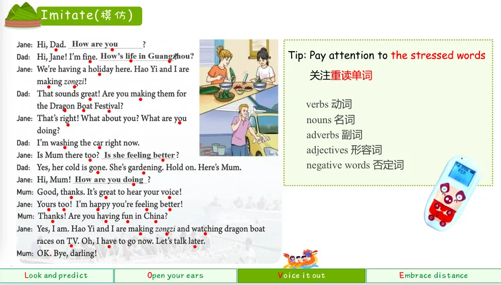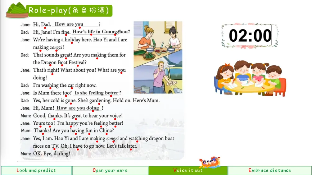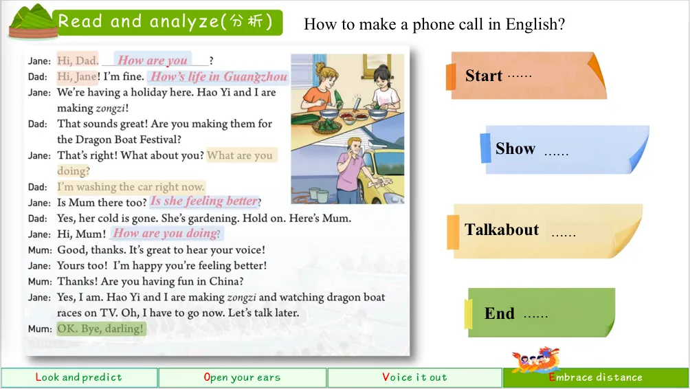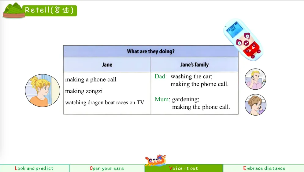 We can do it like this. Look here. It's the Dragon Boat Festival today. Jane is making a phone call… making zongzi… and washing dragon boat races on TV. And dad is washing the car. Mom is gardening.And we can also add a sentence like “Everyone is having a great time.” So can you retell it?Can you? OK. Here we go.