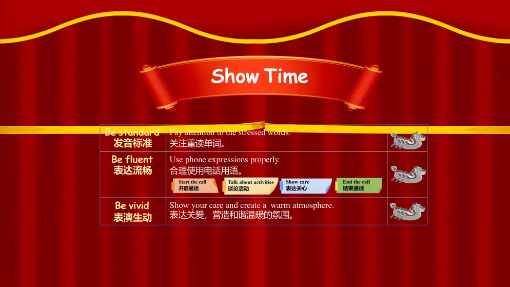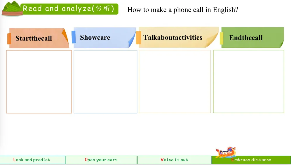 But how can we make a phone call in English? The first step is to…?Yes, start the call. At last we need to….?Yes, end the call. And in a body part, what can we talk about?You, please. Show care and talk about activities. Wow, how clever you are! Yes, we can also show our care and talk about activities. (将对话进行篇章结构分析,提炼目标语言,为学生后续的迁移创新任务提供语言支架)