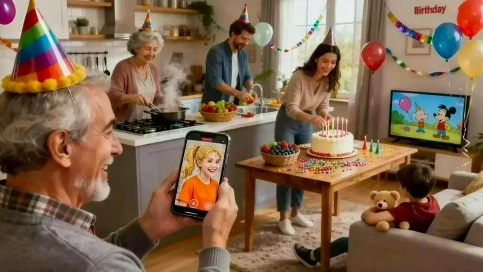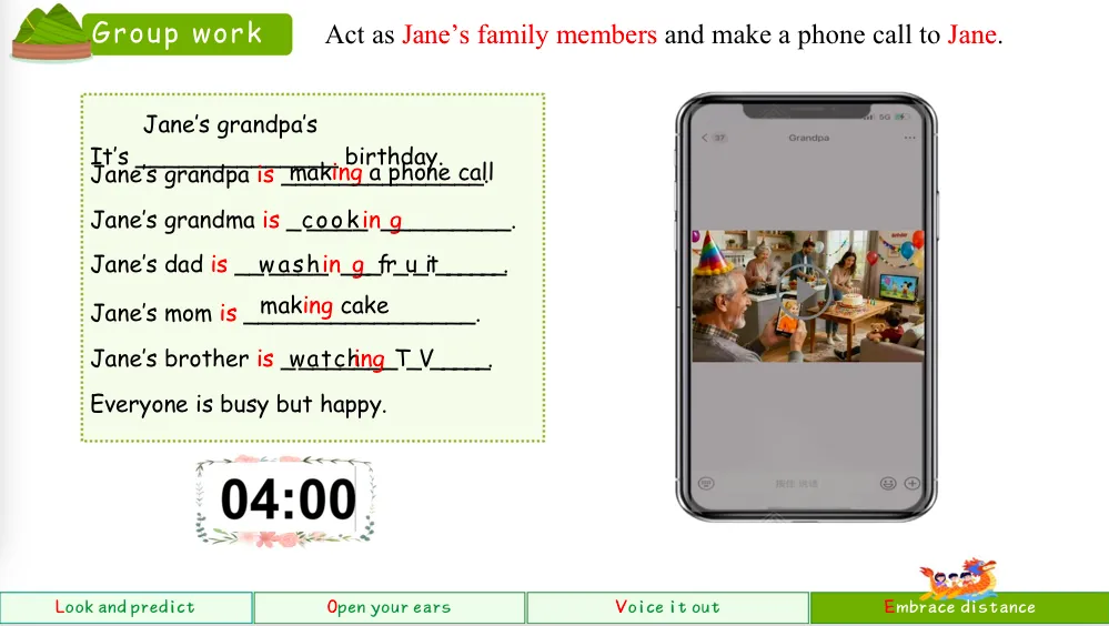 So what are they doing?Yeah, you. They are having a birthday party. Oh, they are having birthday party. And whose birthday party is this? Whose?Jane's grandpa. Good. it's jane's grandpa's birthday. And what are family members doing now? Grandpa is…? Making a phone call.Grandma is…?Cooking. Dad is…? Washing fruit. And the mom is…?Making cake. And brother is…?Watching TV. Everyone is busy but happy.