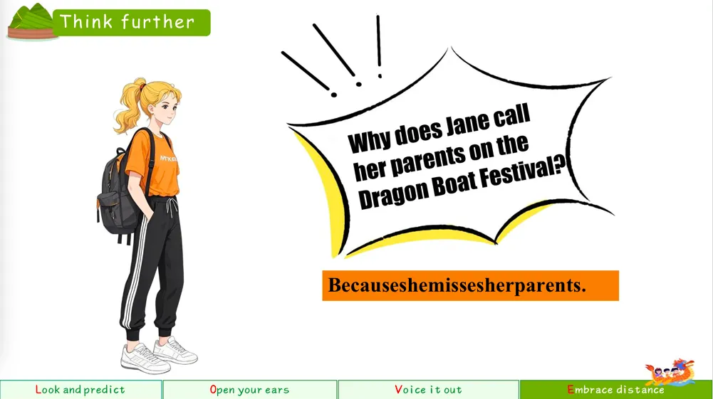 Why does Jane call her parents, especially on the Dragon Boat Festival? Why?You, yes. Because she cares her family. Oh, because she cares about her family. And? How about you? Because she loves her parents. Oh, because she loves her family. Yes, good. And how about you? Because she wants to care about her family. That’s good. And how about you? Because she misses her family.