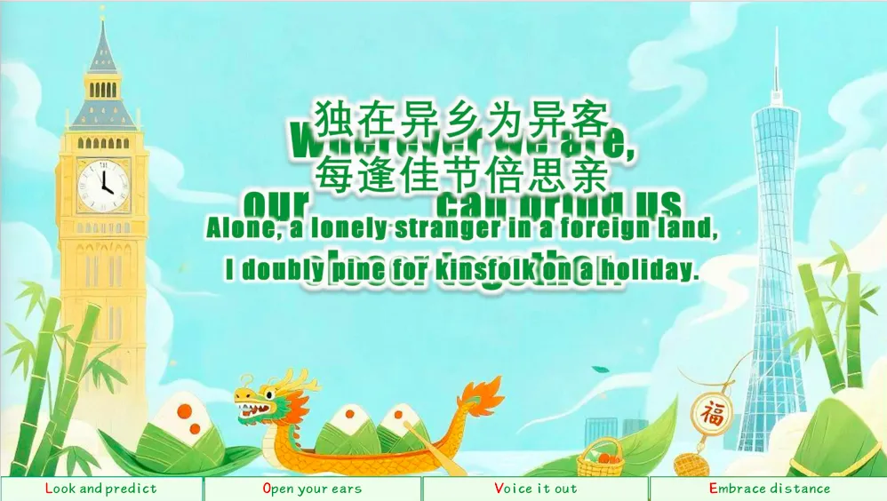 So boys and girls, you know the Dragon Boat Festival is a great time for family reunions in China. So she misses her parents, especially on this day, just as Chinese poem says, “Alone, a lonely stranger in a foreign land, I doubly pine for kinsfolk on a holiday.”
