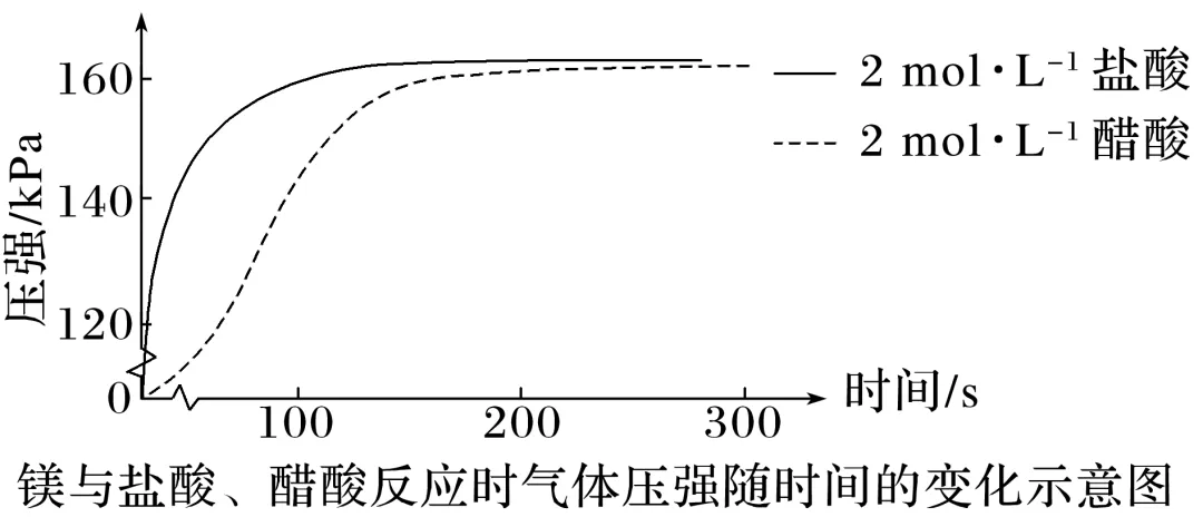向两个锥形瓶中各加入0.05 g镁条,塞紧橡胶塞,然后用注射器分别注入2 mL 2 mol·L-1盐酸、2 mL 2 mol·L-1醋酸,测得锥形瓶内气体的压强随时间的变化如图所示: