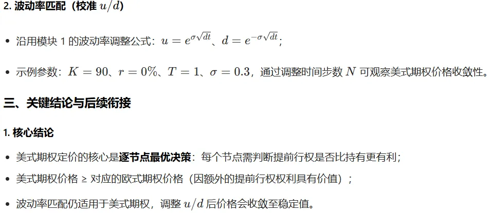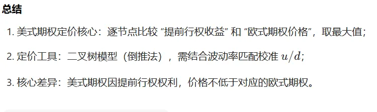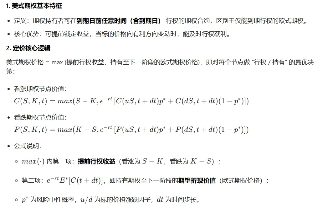 - 美式期权因提前行权特性,需采用动态 Delta 对冲(逐节点调整持仓),区别于欧式期权的静态对冲;