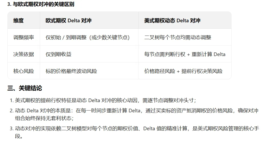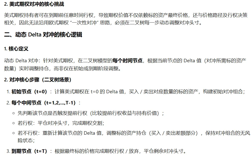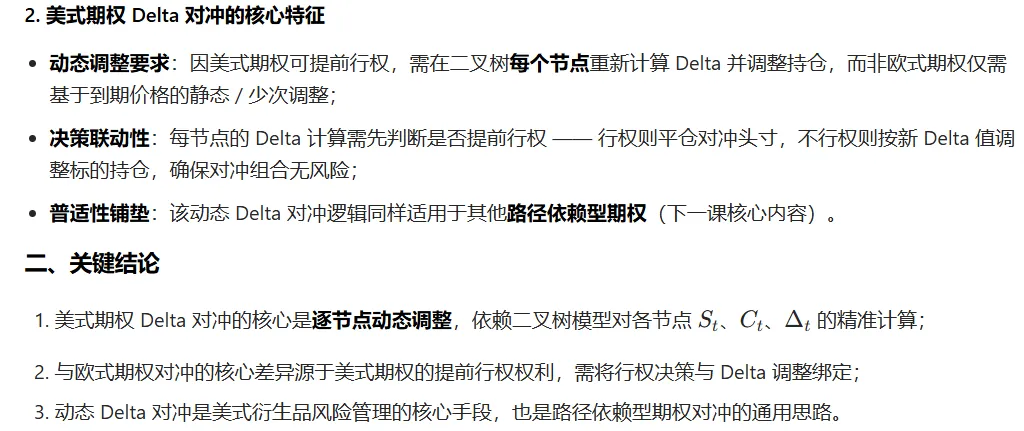 - 动态调整是美式期权对冲的核心(区别于欧式),需逐节点结合行权决策调整 Delta 持仓;