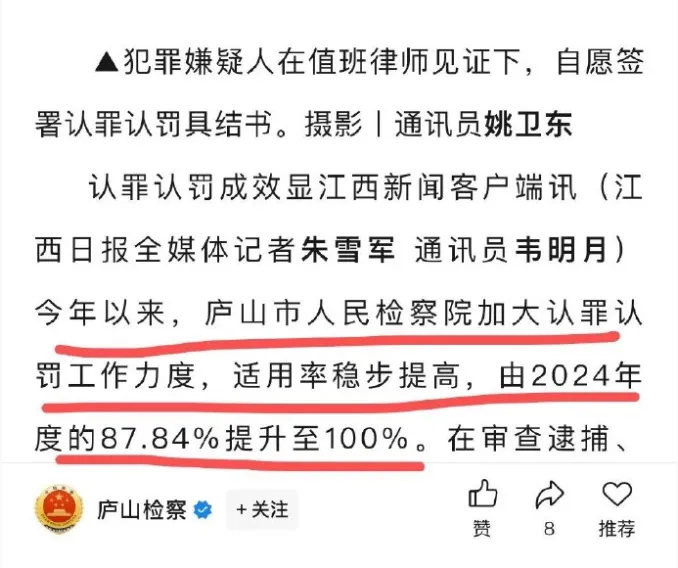 去年5月该检察院官方通报的2024年度认罪认罚适用率从87.84%提升至100%。在发出后不到三天就从官网消失了,大概是舆论的效果不得不撤吧。网络是有记忆的,热心的网友当时截下的图: