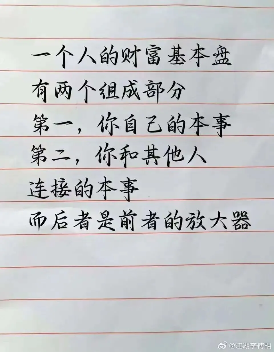 人挣钱的目的,只有一个,就是尽可能的远离所有的人群。昂贵的高档小区,永远安安静静,廉价回迁房小区,永远锣鼓喧天。高铁的商务座、飞机的头等舱、高级餐厅、私人订制都是如此。人赚钱的最终目的,就是尽可能远离所有的人群,而不是为了迎合所有人。不要为了人际关系而苦恼,更不用在意别人怎么看你。你的经济,决定了你的话语权,什么关系都一样;钱是熨斗,可以熨平生活的一切褶皱;根本不用花太多时间去处理生活关系两性关系亲戚关系,你赚钱的最终目的是可以自由远离让你焦虑的一切关系。