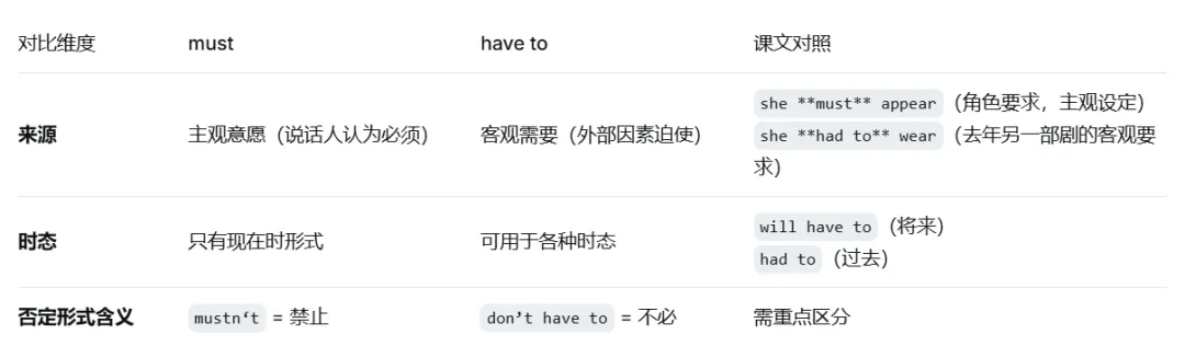 本课集中展示了情态动词 must 的多种含义,并与 have to 形成对比。