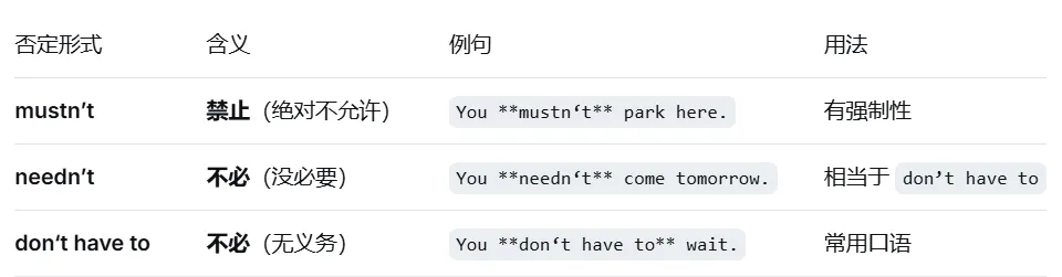 区分否定形式:mustn‘t(禁止)与 don’t have to / needn‘t(不必)。