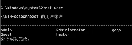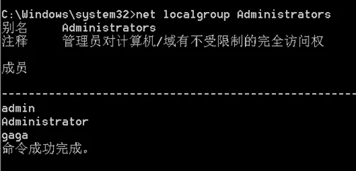 - 再次输入 net localgroup Administrators, 确认gaga用户是否添加到Administrators 组里。