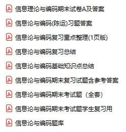 今天分享的资料是「0480-信息论与编码」电子版+学习笔记+知识点总结+期末考试重点+复习资料+习题集及答案+名词解释+历年真题试卷及答案+题库及答案+复习重点+思考题及参考答案+公式总结+考试重点基础题+知识总结+高清PDF可打印+免费分享!