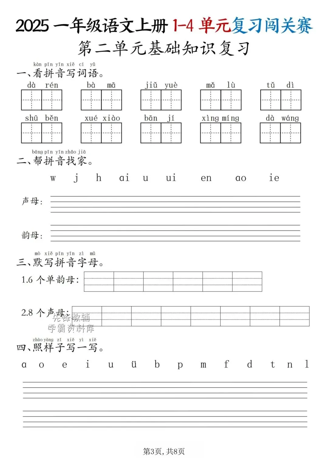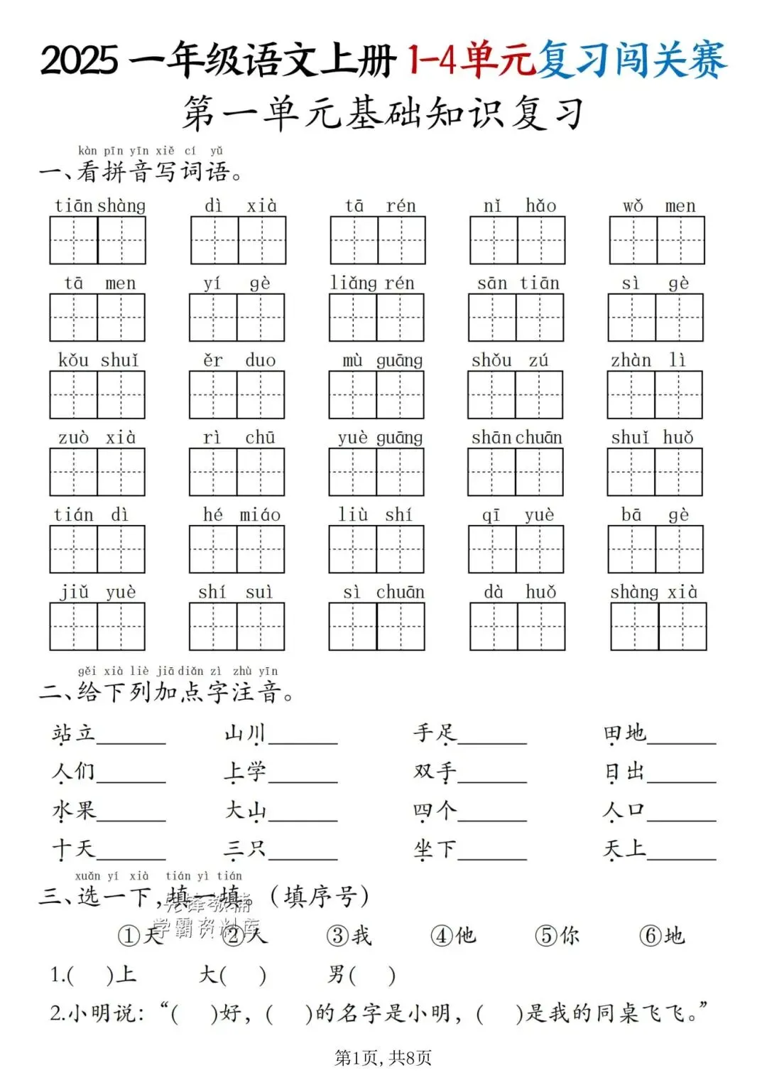 一年级上册语文1-4单元复习闯关赛,电子版可下载可打印,帮助孩子夯学习基础,基础知识查缺补漏,需要的家长抓紧领取吧!
