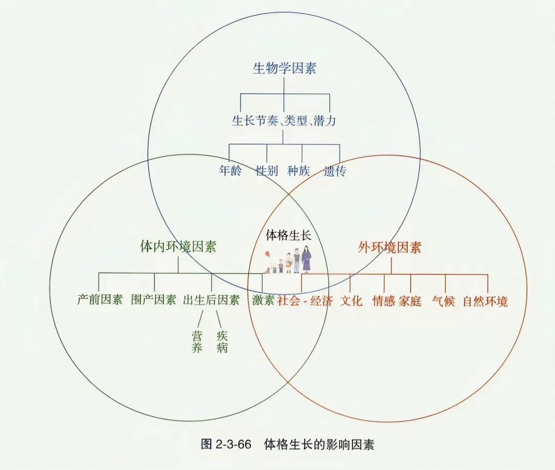体格生长是遗传潜能与环境因素共同作用的结果,可分为三大类:生物学因素、体内环境因素、外环境因素。