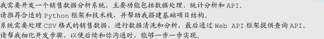 本项目名为SalesAnalyzer。它是一个基于Python开发的销售数据分析系统,旨在高效处理和分析销售数据。该系统通过读取CSV文件中的销售数据,使用Pandas库进行数据清洗、汇总和统计,自动计算各产品及区域的销售总额。同时,我还设计了一套规则体系,能根据统计结果匹配合适的促销策略与优惠折扣,为制定营销方案提供决策支持。我计划将SalesAnalyzer设计为前后端分离的项目,后端专注于业务逻辑处理,前端负责数据可视化展示。前端页面将采用Vue.js框架开发,结合图表库展示各类销售数据分析结果。通过直观的图表和数据面板,用户可以快速掌握销售趋势和关键指标。本项目使用FastAPI框架构建RESTfulAPI,提供销售概况、产品详情、区域销售汇总和智能折扣建议等多个数据查询API。项目架构清晰地分为数据处理层、业务逻辑层和API层,便于后期扩展和维护。SalesAnalyzer不仅能清晰地展示销售数据,还展现了数据处理、业务逻辑和Web API的完美结合。这个系统也是Cursor自动生成代码在实际项目中应用的典范。至于Pandas、FastAPI这些Python框架,我也只是听说过,从未实际使用过。前端的Vue.js框架就更没用过。不过,有了Cursor这个强大的AI辅助编程助手,我完全不用担心这些技术栈的问题。通过与Cursor的对话交互,我可以快速学习和掌握这些框架的使用方法。这种边学边做的方式不仅帮助我快速完成项目开发,还能让我在实践中积累宝贵的经验。首先,我们来实现这个项目的后端部分。我们将使用Python和FastAPI框架来构建一个强大的RESTful API服务。高效沟通的技巧在与Cursor进行有效沟通时,以下几点技巧尤为重要。- 明确描述需求在向Cursor描述需求时,应该尽可能具体和清晰,需要详细说明项目背景和目标,明确指出使用的技术栈和框架版本,提供具体的功能描述和预期结果,说明性能要求和限制条件。