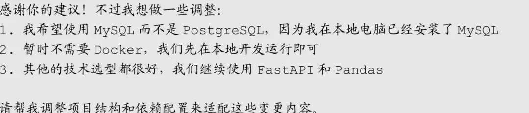 首先,我们需要创建一个清晰的项目结构,这里包含了各个包、组件,以及用到的Python框架、技术选型。但是我对Python的数据分析框架和Web框架不熟悉。这时,我们可以询问Cursor,让它来推荐。我们在AI对话区打开“CHAT”面板,然后告诉Cursor我们想要做什么事情,提示词如下。可以看到,Cursor很快就给出了技术方案和开发步骤。CHAT”面板提供了一种交互式、多轮对话场景。与“COMPOSER”面板最大的不同是,在“CHAT”面板中,Cursor不会修改任何代码,而是预演可能需要修改什么文件、可能需要用到什么技术等,所以在使用“CHAT”面板时,我们完全不必有任何负担。你可以把它当成一个结伴编程的老大哥,有啥不懂的,或者觉得不合适的地方都可以对它说。比如,它希望我们用到PostgreSQL和Docker这两项技术。我本人觉得没必要,因为我暂时只想让这个项目在本地电脑运行,而且我的本地电脑已经安装了MySQL数据库,我希望它可以沿用。现在,我对它提要求,让它按照我的想法来改。提示词如下:Cursor很快就做出了调整。从它的回应中可以看到,Cursor不仅能够理解我们的需求变更,还能够灵活地调整建议,这正是Cursor最宝贵的特质之一。以下内容是我截取的对话原文。修改配置信息前面已经提到,我在本地电脑已经安装了MySQL数据库。现在,我需要做的就是告诉Cursor我的真实的MySQL用户名和密码,让它来修改连接信息。我可以这样对Cursor说,提示词如下。接下来,我们应用Cursor的修改。打开MySQL数据库管理软件Navicat,新建一个名为“sales_analysis”的数据库。后端项目的运行需要Python环境。我们先从Python官网下载并安装Python。我们将光标悬浮于“Downloads”菜单上,就可以看到适合本机系统的下载按钮了。将Python下载到本地,然后跟随安装指引进行安装即可。在安装完毕后,我们需要在控制台查看Python的安装情况,就证明已经安装成功了。这里分享一个小技巧。我下载完Python并安装后打开控制台,一开始输入的是“python”,但是系统提示找不到这个命令。接下来,我直接把这段系统提示信息输入Cursor。注意:我此时打开的是“COMPOSER”面板,并且使用的是agent模式。所示为Cursor的输出内容。这种学编程,改Bug的体验真的太爽了。Cursor项目进阶:销售数据分析(前端Vue.js框架部分)在本章中,我们将探讨如何使用Vue.js框架构建销售数据分析系统的前端页面。我们将重点关注如何利用Cursor加速Vue.js框架的组件开发,并实现流畅的用户交互体验。通过结合Vue.js框架的响应式特性和Cursor的智能辅助功能,我们将打造一个既美观又实用的Web应用页面。前置工作