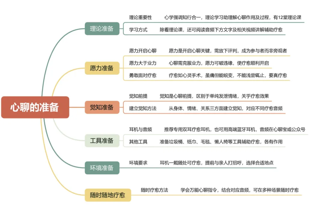 需要准备的六个工具分别是:专用的心聊耳机(或有降噪功能的蓝牙耳机)、音频(可通过心聊宝的卡获取或从 “心聊术” 公众号获取)、垃圾桶或垃圾盆、纸巾、毛毯、懒人椅。