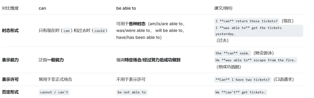 区分 can(一般能力/非正式请求)和 be able to(可用于各种时态,强调成功做到)。
