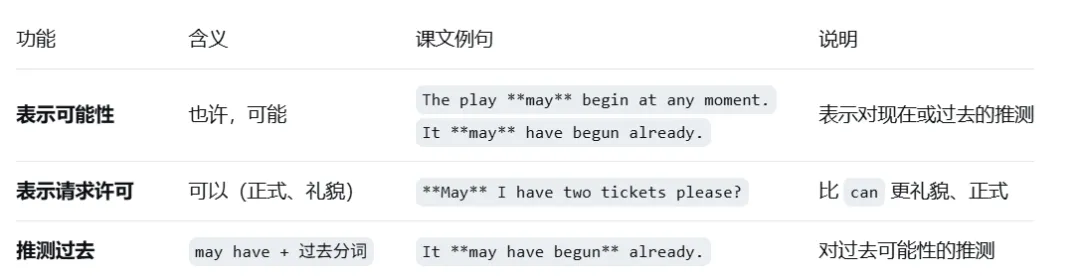 本课集中展示了情态动词 can、may 以及 be able to 在表达“能力”、“可能性”、“请求许可”等方面的用法和区别。