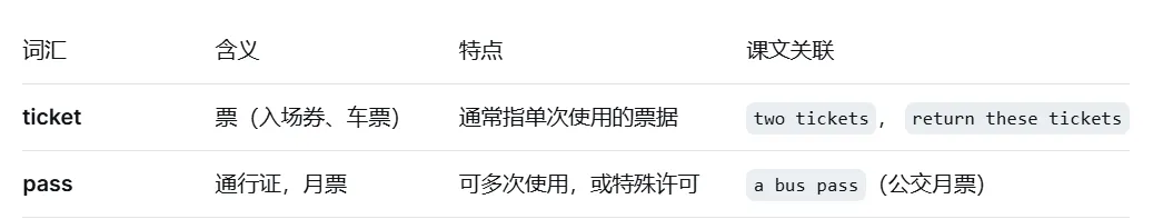 词汇辨析:ticket(票)vs. pass(通行证); pity(遗憾)vs. sympathy(同情); exclaim(惊叫)vs. shout(喊叫)