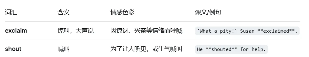 区分 exclaim(惊叫)和 shout(喊叫)。