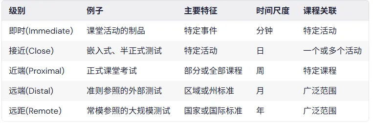 这五条连续体的意义在于:不同位置的评估聚焦不同的能力,因此有不同的敏感性和功能。理解这一点至关重要,否则一个低年级单位测验的分数会被误用作政策决策的依据。如PISA、TIMSS、NAEP这种大规模测试就属于远距(Remote)评估,服务于国际教育政策决策;而湖北省元月调考这种区域性考试就属于远端(Distal)评估,服务于省升学考试的题目制定及升学政策决策。