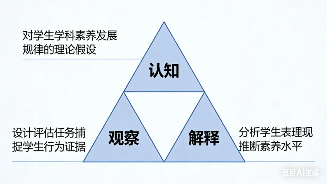 Pellegrino 认为所有评估的本质都是从证据到推理的过程,这一过程由「评估三角」构成,且三大要素必须相互协调、高度契合,才能保证评估的有效性: