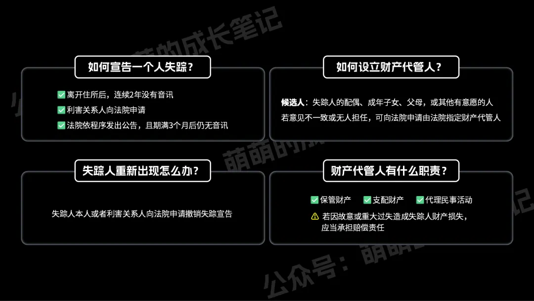 在对一个人宣告失踪后,接着要为失踪人设立财产代管人。财产代管人可以是失踪人的配偶、成年子女、父母,或者是其他有意愿的人。若对谁担任财产代管人的意见不一致,或者没有人来担任财产代管人,利害关系人可以向法院申请,让法院指定一个财产代管人。