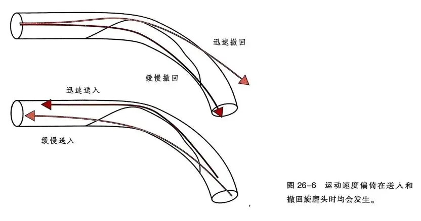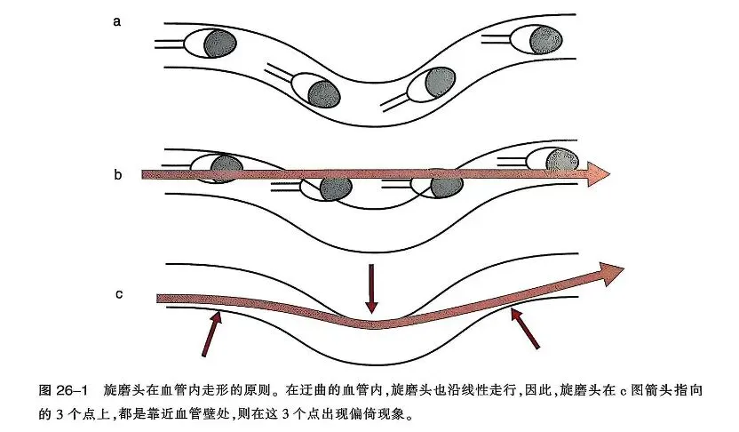 更加值得注意的是,旋磨头及其传动轴具有一定的刚性。在弯曲血管中,若导丝位于小弯侧,旋磨头在推进过程中会试图将弯曲的血管强行拉直。这使得旋磨头不是顺着血管的自然弧度滑过,而是像一把 “锉刀” 一样,在小弯侧进行深度的切削,并发症风险显著增加。