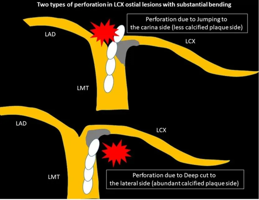 偏向钙化对侧:消融不到钙化结节导致病变准备不足;若对侧为正常组织,旋磨头可直接损伤正常管壁,存在极大的穿孔风险。