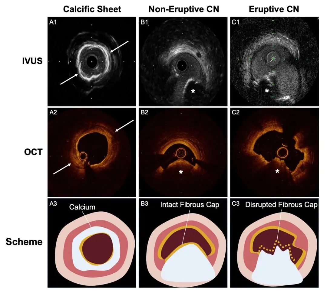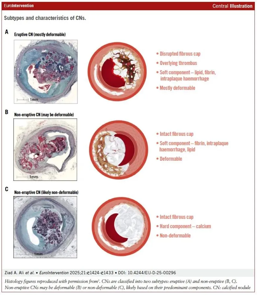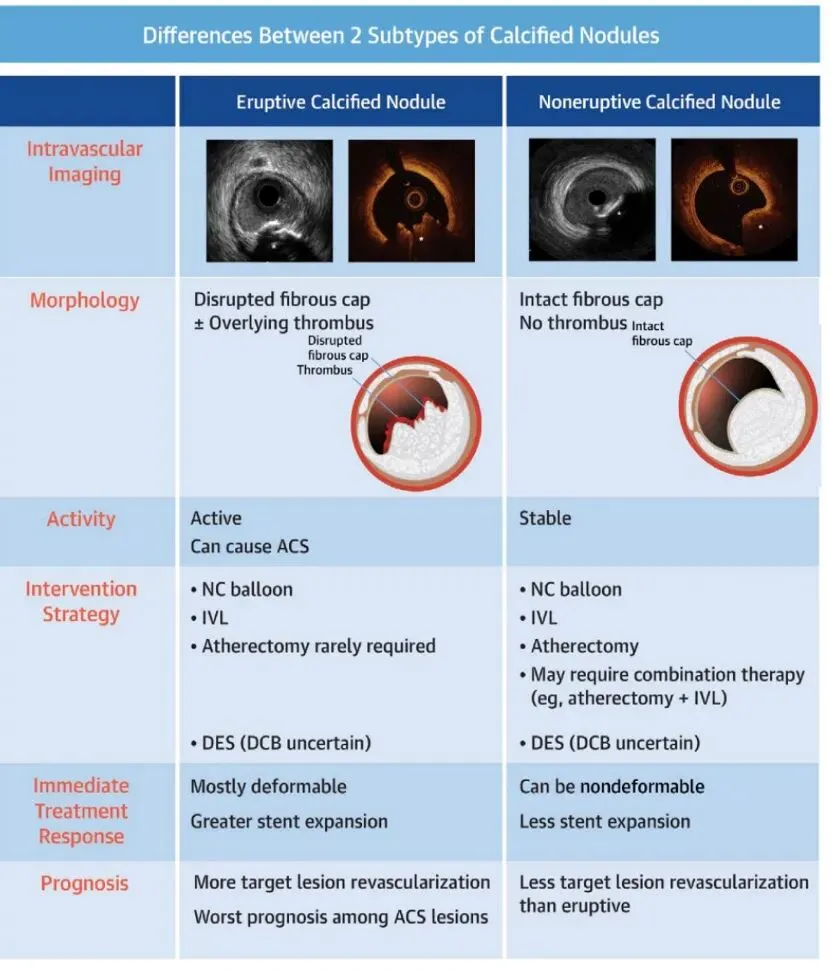 非爆发性结节: 纤维帽完整、无血栓形成,多见于稳定型冠心病。因钙化程度重、支架扩张困难,常需联合旋磨等多种策略。但若处理得当,其远期再狭窄率反而较低。