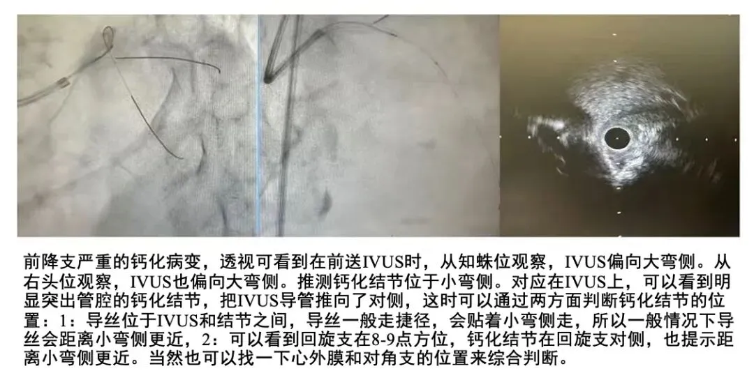 如何判断钙化结节的位置:可以通过前送IVUS,结合冠脉造影和IVUS影像判断(如下图所示)。判断钙化结节的位置,还有一个需要关注的问题:大弯侧没有心肌保护,穿孔风险相对于小弯侧要更高,所以小弯侧严重突出管腔的钙化结节+大弯侧健康血管被挤压、变薄,是穿孔高危影像,也就是下面要说的帐篷征。