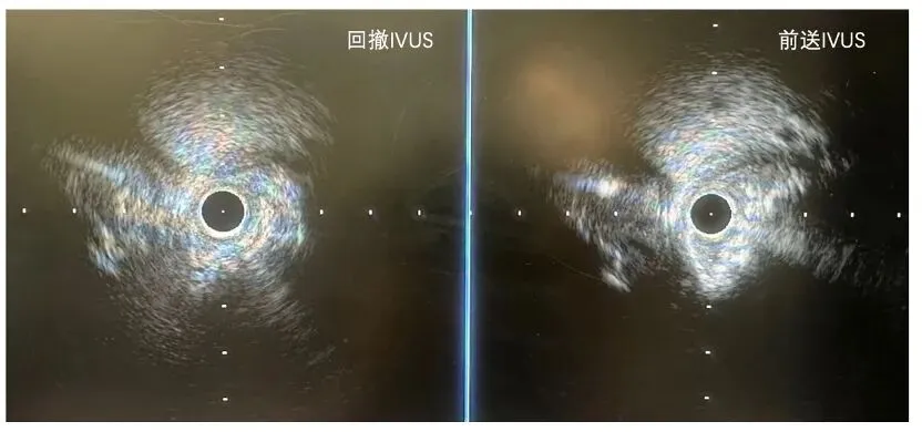 从上面两幅图可以看到,前送(push)IVUS时,在钙化结节处和病变以远,IVUS导管都更加接近、挤压对侧管壁的正常血管组织,考虑穿孔风险高,所以这个病人最终选择了OAS处理。