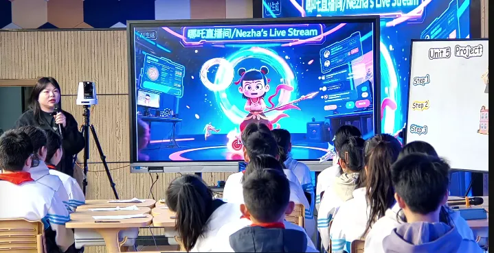 Hey, guys. Thank you for your help. Now, my live stream is working. Today, let's travel around the world and see what people are doing right now. Are you ready? Let's go!(利用AI技术,学生齐念魔法咒语,哪吒带着神秘任务进入课堂,情境创设生动有趣,通过中国神话故事人物哪吒这一形象构建跨文化交流平台。)