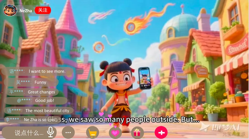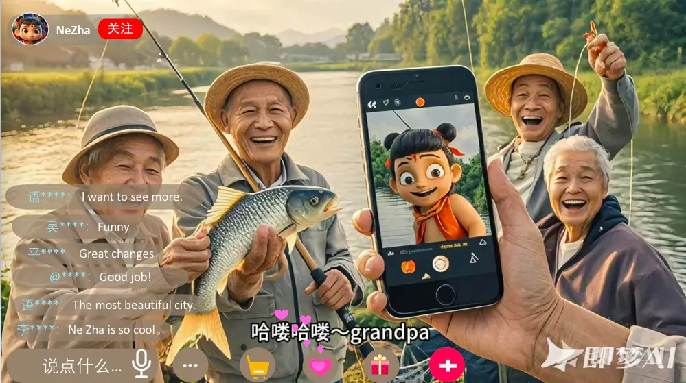 (直播片段2出现哪吒与爷爷们的对话: Hello, hello, grandpa. 哈喽, 小哪吒。)