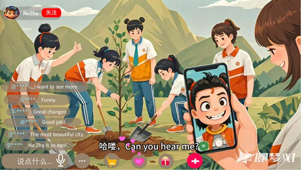 (直播片段4几位正在植树的女生和哪吒连线聊天: Hello! Can you hear me? Hi, Ne Zha. We can see you. )