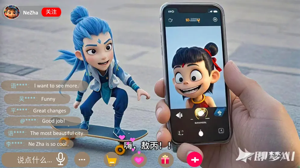 (直播片段5敖丙踏着滑板车来到哪吒跟前,哪吒说: Hello! You are so cool. )