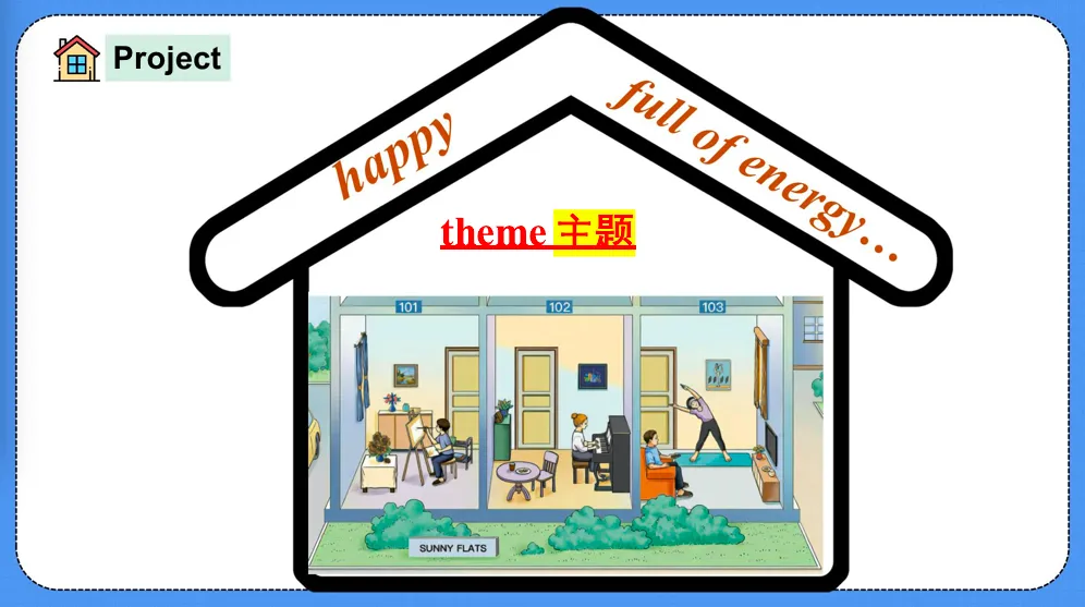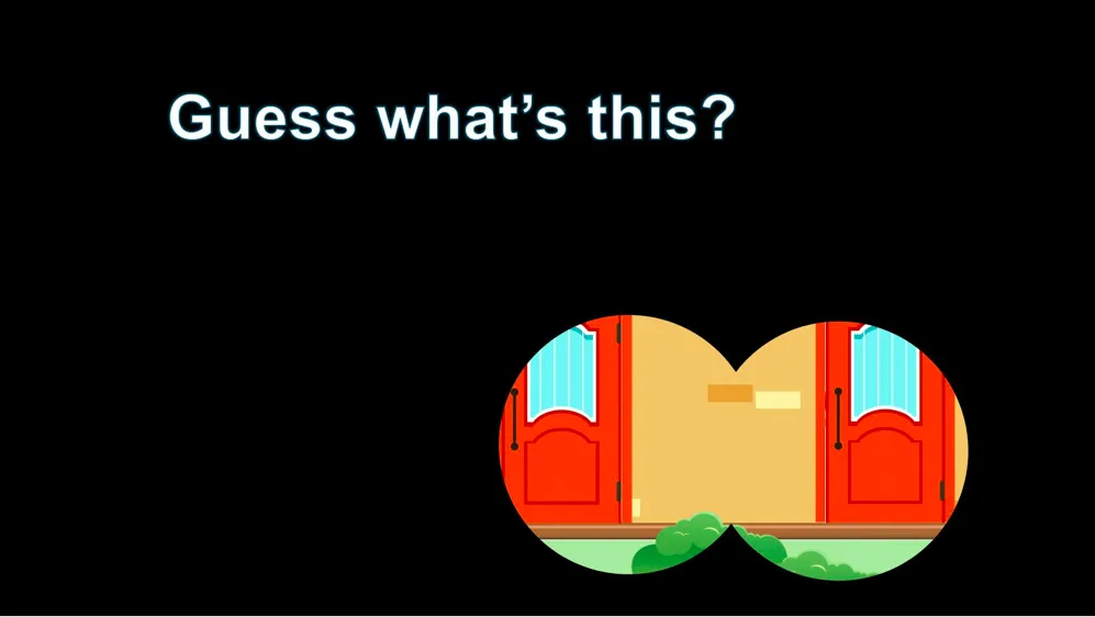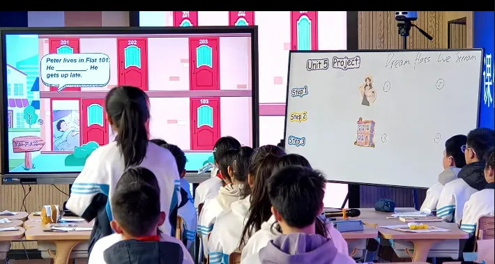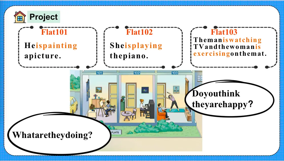 OK, let's listen to the last one.So what’s the person doing?OK, that boy. Yes, maybe. OK. Let’s guess. What else? Anyone else? What is the person doing? OK, can you try it? OK. You try it. He is playing the piano. Maybe. So let's open the door.So what’s the person doing?Dancing. Yes, so read it together. Bob lives in…, 1, 2, start. Bob lives in Flat 203, he is dancing. He also likes singing. So we can see people are doing different things in their flats. (再次技术赋能,呈现一幢公寓中6户人家的生活场景,学生听音猜活动,教师再打开房门验证。采用师问,生逐答,并读出巩固关于这一生活场景的描述。)