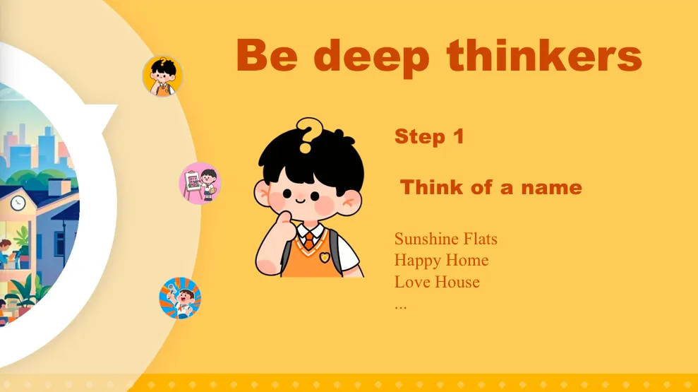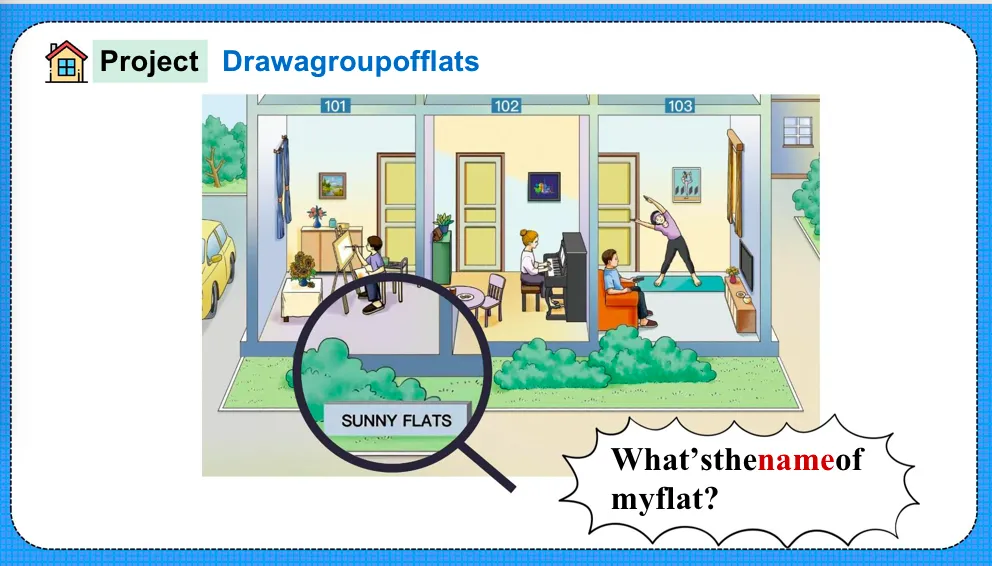 Think what?Think what? Think of a name. Yes, so we should think of a good name for your flats, Sunshine Flats, Happy Home, Love House and so on. You can choose one.