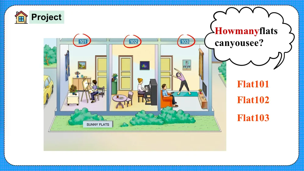 Guess what's this?A flat, two doors. And then, two rooms. And then, a name. What's the name?Fun Flats. So read after me, three fingers. /æ/,/æ/, flat, flat. What does flat mean?How clever you are! Now how many flats can you see? Six flats.And how many floors?Two floors.