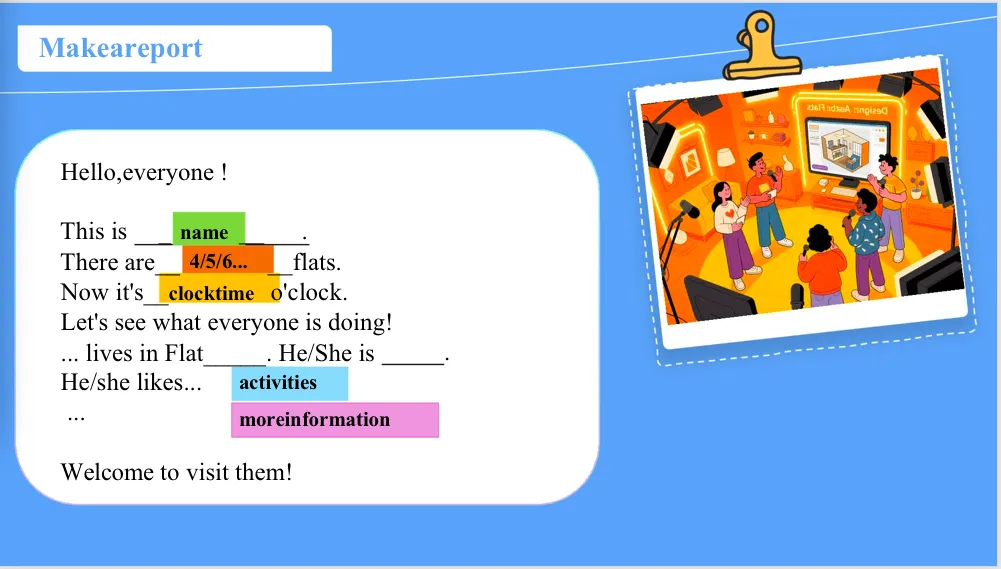 First you should greet and then tell us the name, the number of your flats and clock time. In the body part, you should say somebody lives in Flat…. He or she is …. He or she likes…. If you like, you can add more information. At last, you can invite us to visit your flats. Got it? Yes.(提供Report 模板供学生参考,为基础薄弱的学生提供了语言支架)