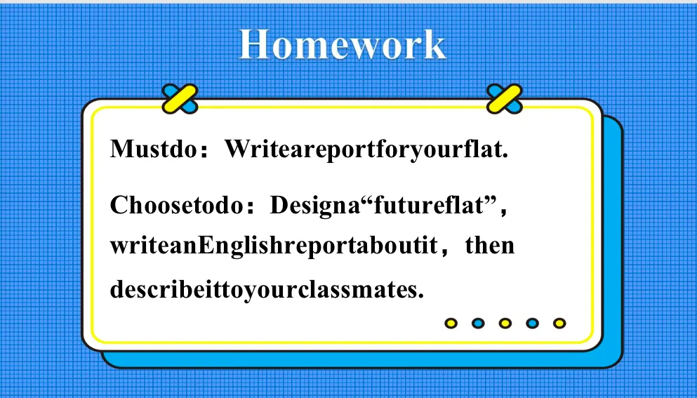 So after class, I hope you can write a report for your flat. And if you have time you can design a future flat. Write an English report about it and then describe it to your classmates. Got it? OK.
