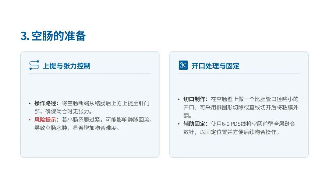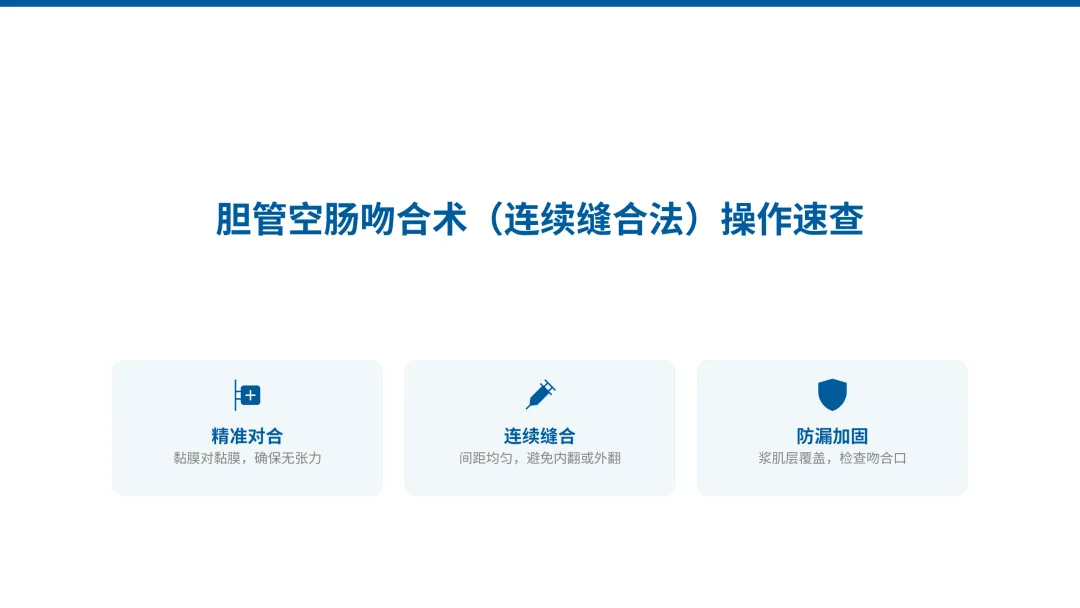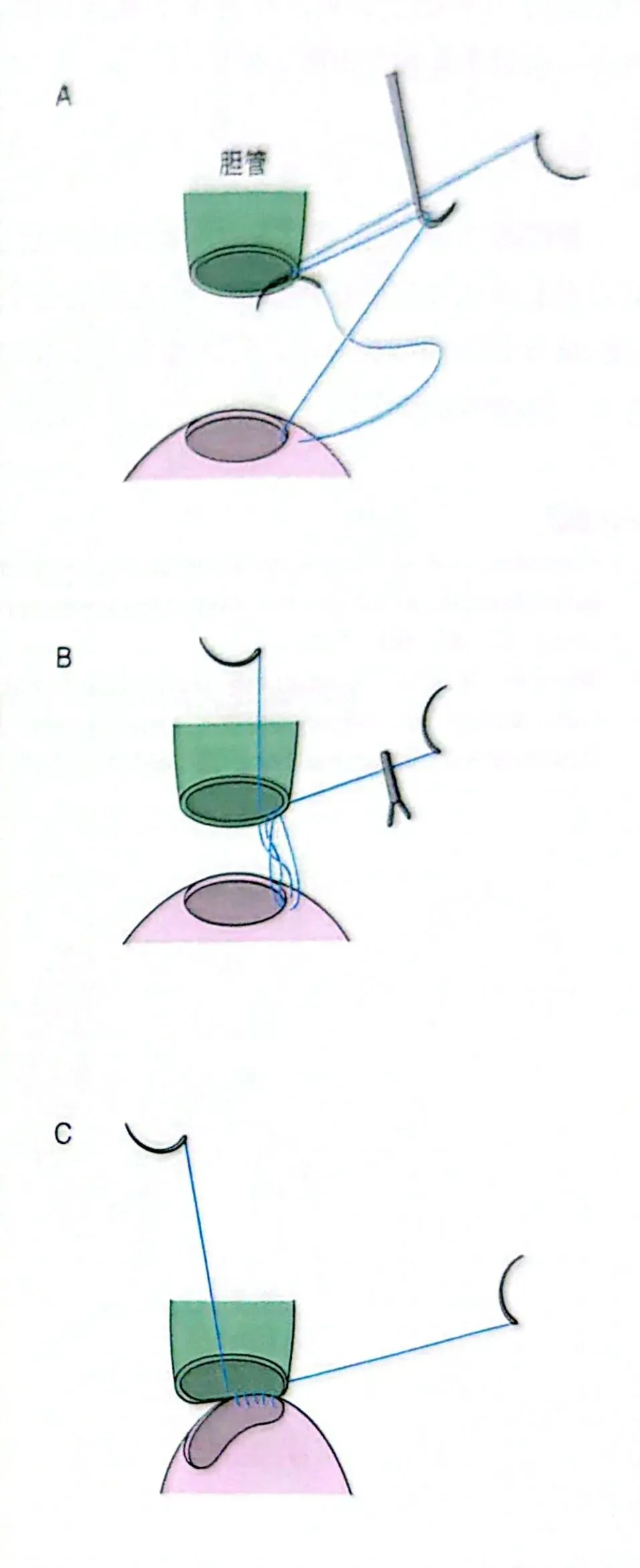 B. 缝合约3针后使胆管和空肠紧贴。适度收紧以避免缝合不全,这是非常重要的C. 按通常的从空肠向胆管的顺序运针