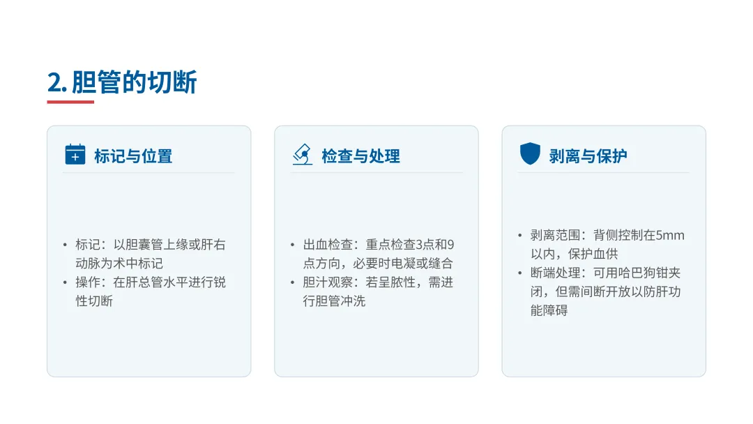 通常在肝总管水平切断。一般以胆囊管上游或肝右动脉作为术中标记。从胆管血运和手术操作来讲,胆管断端靠近胰腺无太大意义。一口气锐性切断胆管,此时一定要注意胆管残端(多于3点、9点处)有无动脉出血和胆汁的性状。没有动脉出血时要追加切除。若有脓性胆汁要冲洗胆管。之后,用电凝或缝合进行最小限度的止血。即便手术视野较深,胆管背侧剥离5mm就足够了,进一步的剥离可能会影响胆管的血运。使用不影响视野的钳子(哈巴狗钳等)夹住断端,防止胆汁污染视野。间断加以开放,防止术后肝功能障碍。
